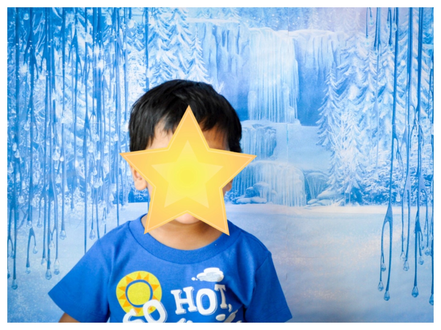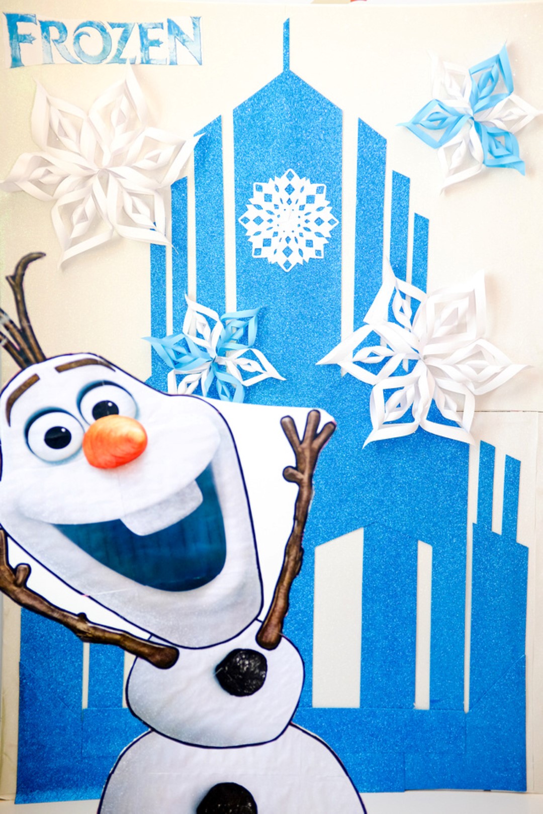 For the Photo Booth backdrop, I used some blue glitter sheets and tried to copy Elsa’s castle (as much as I could…). I then made some 3D snowflakes and attached to the backdrop. Here is an easy tutorial on how to make these 3D snowflakes.