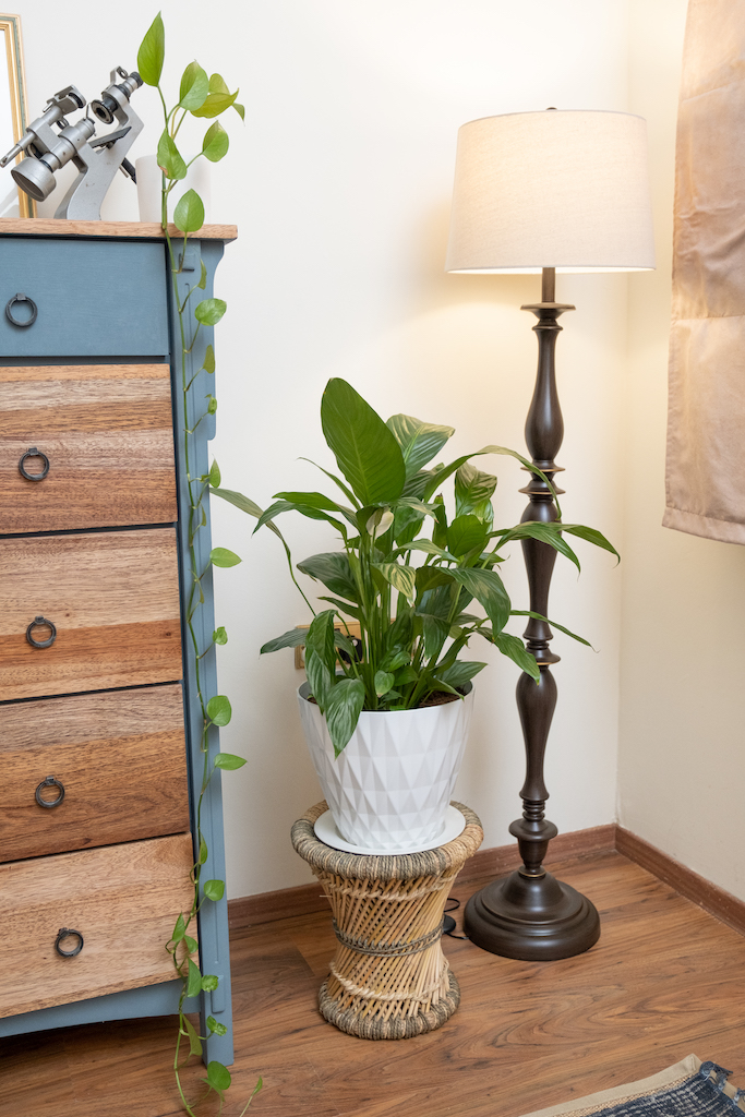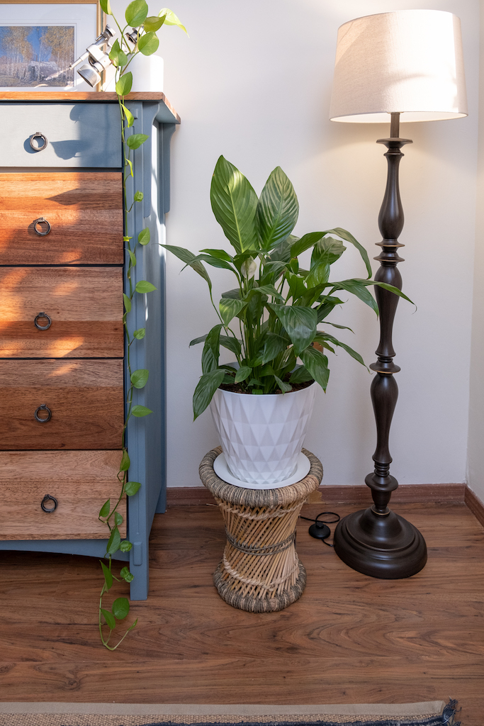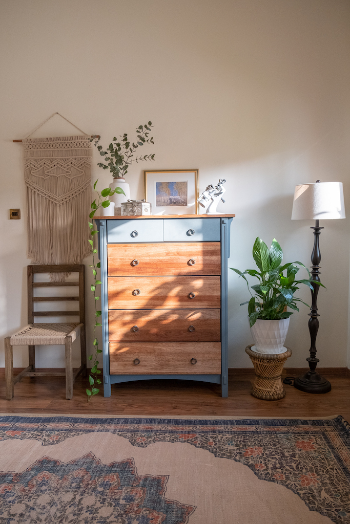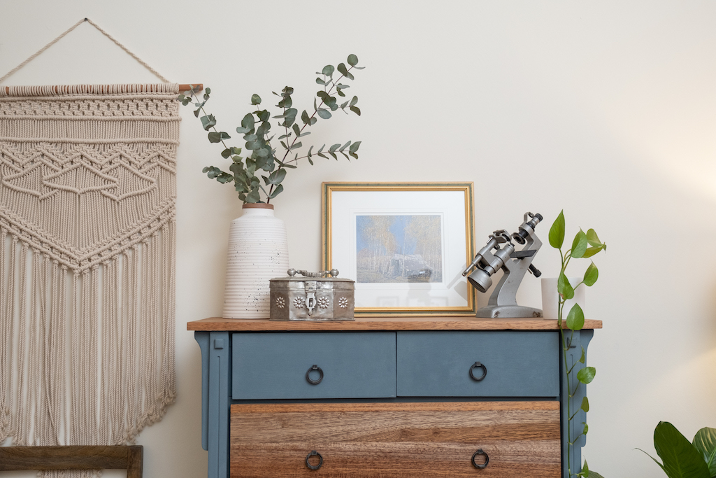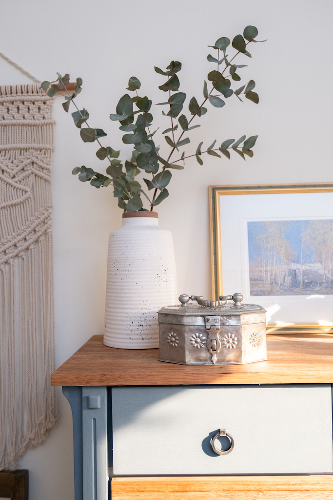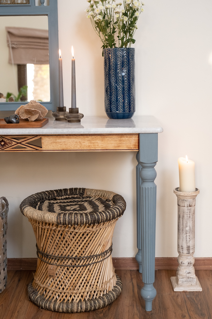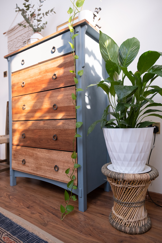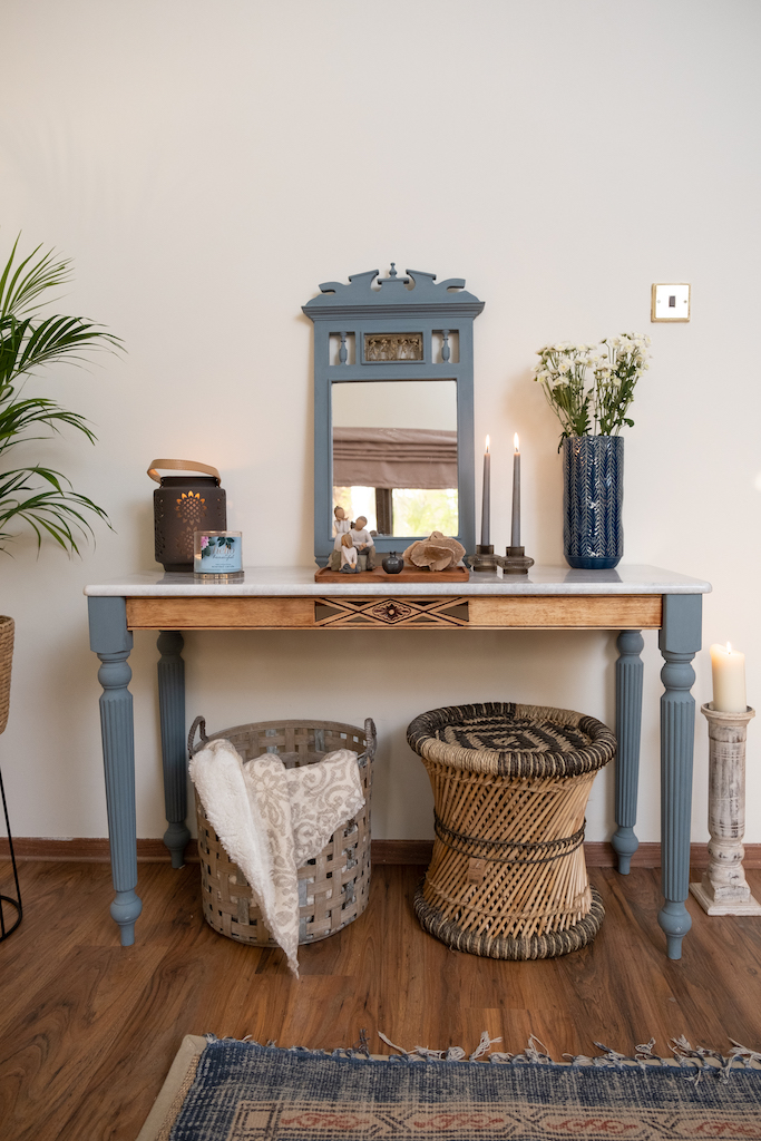 When I decided to do something with this room, I first connected with Rochelle, who has started a new venture, Aishaโs Attic, where she gets old furniture and refurbishes them. She puts new life in those old pieces – sheโs a magician! Itโs such a fantastic way of reusing old stuff. It is eco-friendly, but I love the character and story that these old pieces bring to a room. I wanted a chest of drawers for the guests to have some space for their stuff and a mirror/dressing area for the grandmas! Rochelle found these two pieces as per my requirement from the Facebook marketplace, and after a few brainstorming sessions, we decided on what we want to do with them.