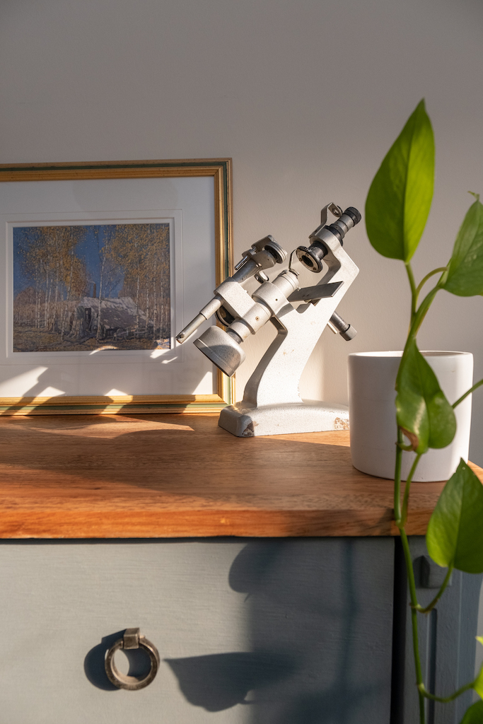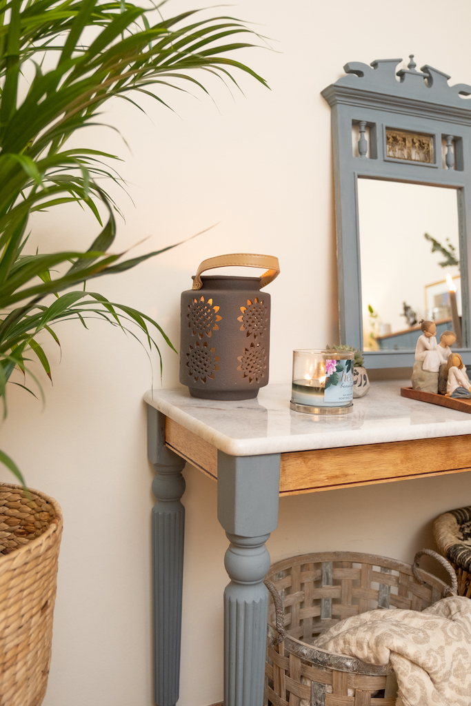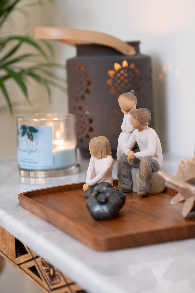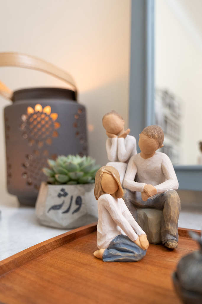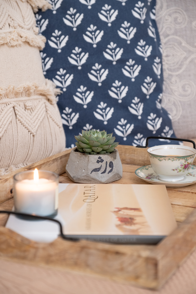 I like pretty decor pieces, but more than that, I like the story behind them. This room has many old things and elements like Mohsin’s daadi’s paandaan and my father’s lensometer from his clinic. I also wanted to have some cultural pieces that remind the guests of our culture and show them a little bit of the Qatari heritage (hence added elements like a desert rose, and coffee table book on Qatar etc.). The Willow Tree figurines that were are a gift from my brother, symbolizing us siblings.