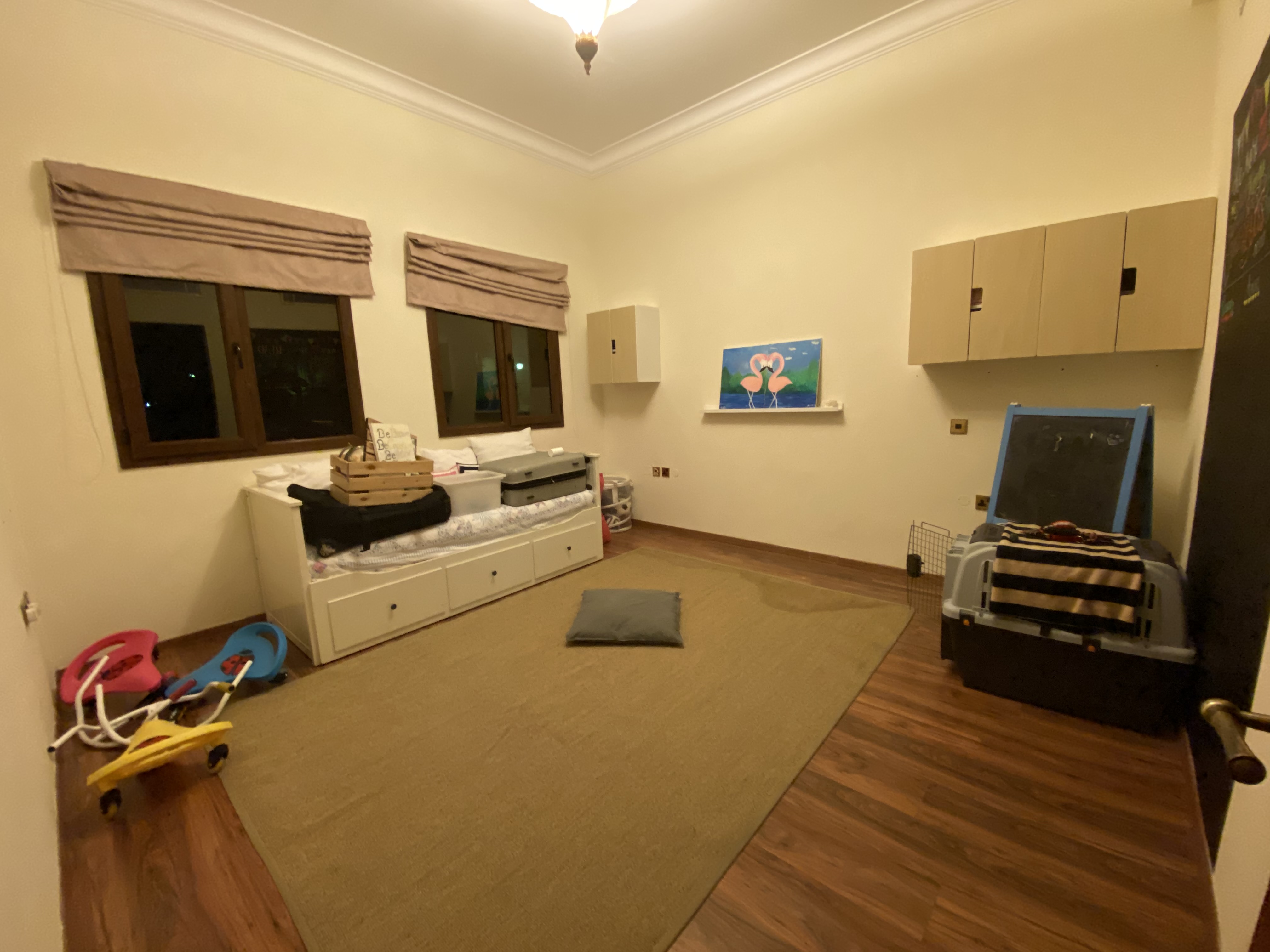 When we moved to this house about three years ago, I converted this room downstairs into a play area/ study area for the kids. Now that the kids are older and much more independent, we moved their study desks in their bedrooms, and this room became a room where we would keep Sheru (our dog) while he was house trained.